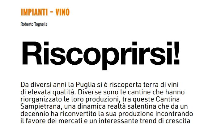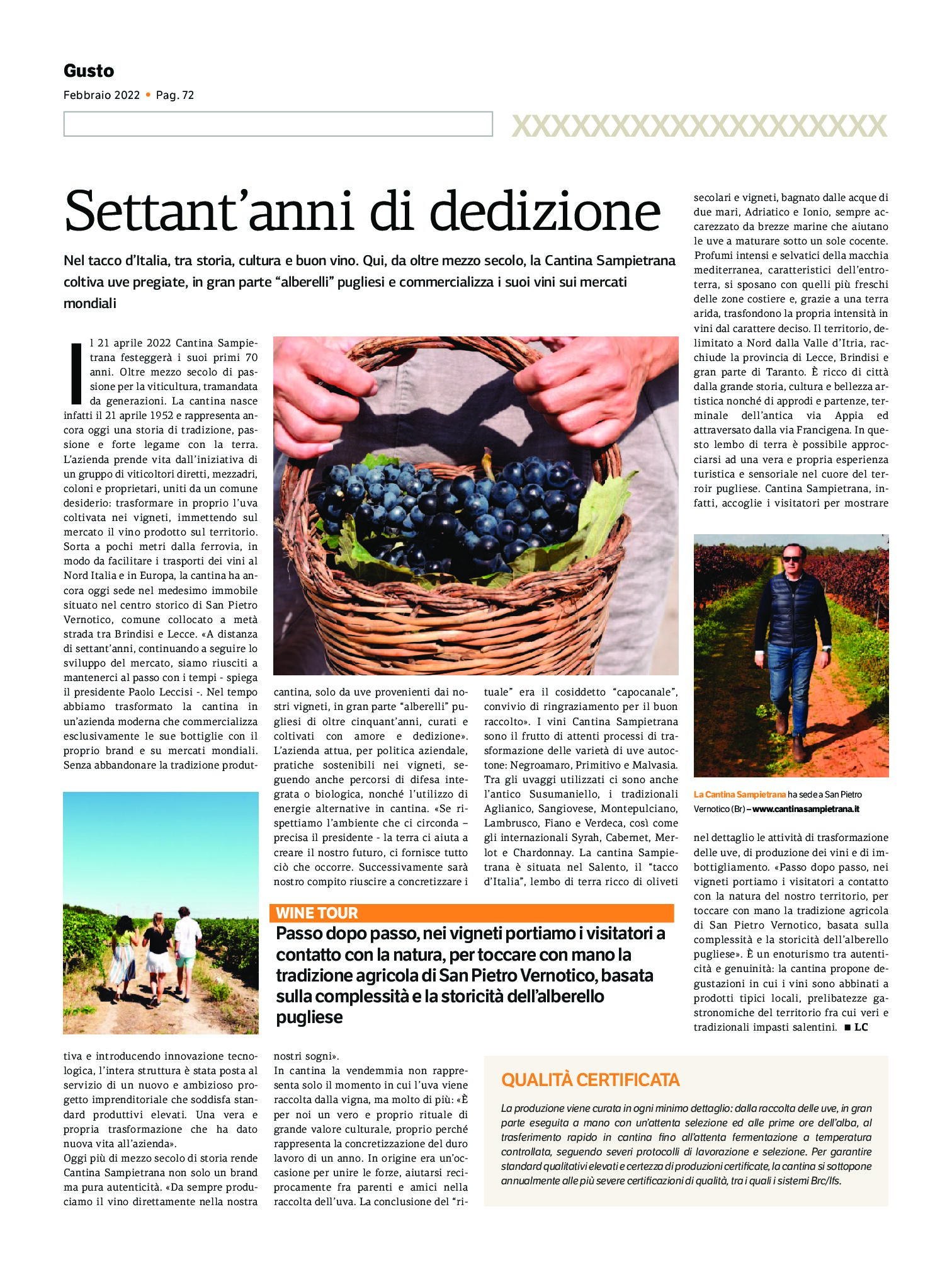 A distanza di 70 anni, seguendo lo sviluppo del mercato, Cantina Sampietrana è riuscita ad essere al passo con i tempi, trasformandosi negli anni in un’azienda moderna che commercializza esclusivamente le sue bottiglie con il proprio brand e su mercati mondiali.